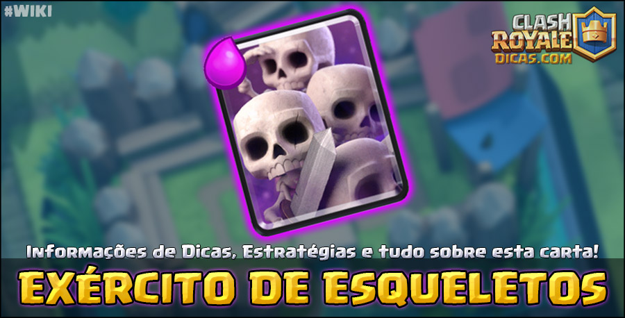 Confira abaixo algumas informações técnicas sobre o Exército de Esqueletos de Clash Royale. Estas informações podem ser consultadas diretamente no jogo, clicando no menu de cartas e em seguida sobre a tropa que deseja saber as informações, mas de qualquer forma acho interesse fazer uma Wiki aki no site com informações de tudo sobre o jogo!
