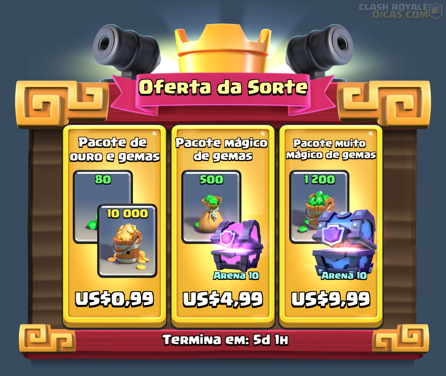 As ofertas oferecidas na loja são estas mostradas no print abaixo, sendo a mais barata com 80 gemas e 10k de ouro, outra de 500 gemas e um baú mágico e a mais cara custando 31,99 reais por 1.200 gemas e um baú super mágico: