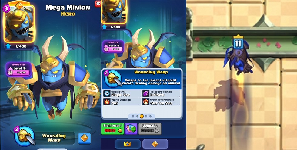 Ao ativar sua habilidade, ele se teletransporta até o alvo marcado e causa dano extra no primeiro impacto, além de ficar momentaneamente difícil de interagir durante o deslocamento (vídeos da versão de desenvolvimento do Clash Royale fornecida a criadores de conteúdo revelam que ele não pode ser alvejado enquanto teleporta).